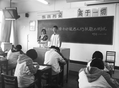 昨日下午1时,在市49中教学楼5楼两间教室里,72名学生埋头疾书,貌似正在考试;“监考人员”是穿着校服的学生,黑板上醒目地写着“第二十四届学生会、团委干部候选人行政能力测试”。
