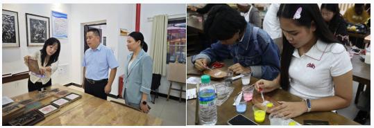下一站移步至天工制作坊,留学生们开启非遗技艺体验。在工作人员引导下,大家参观了工艺品展厅,精美的陶塑、绚丽的漆画、生动的版画让大家连连赞叹,不时驻足细看。队伍来到景泰蓝工坊,听工作人员介绍景泰蓝的历史渊源与制作流程,在专业老师的指导下沉浸式投入景泰蓝工艺画的制作环节。他们小心翼翼地掐丝、点蓝,手法略显生疏,但专注的神情尽显对非遗技艺的景仰与喜爱。一位泰国学生表示:“景泰蓝的色彩太漂亮了,制作过程需要耐心,我太佩服中国的这些非遗技艺了!”